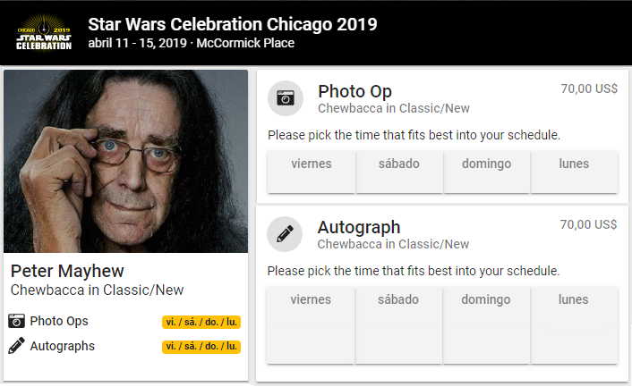 El 6 de Febrero la página de StarWars.Com anunciaba que Peter Mayhew estaría presente en Star Wars Celebration Chicago y que estaría firmando autógrafos y tomándose fotos con los fans en la zona de Autógrafos organizada por Star Wars Authentics de Topps.