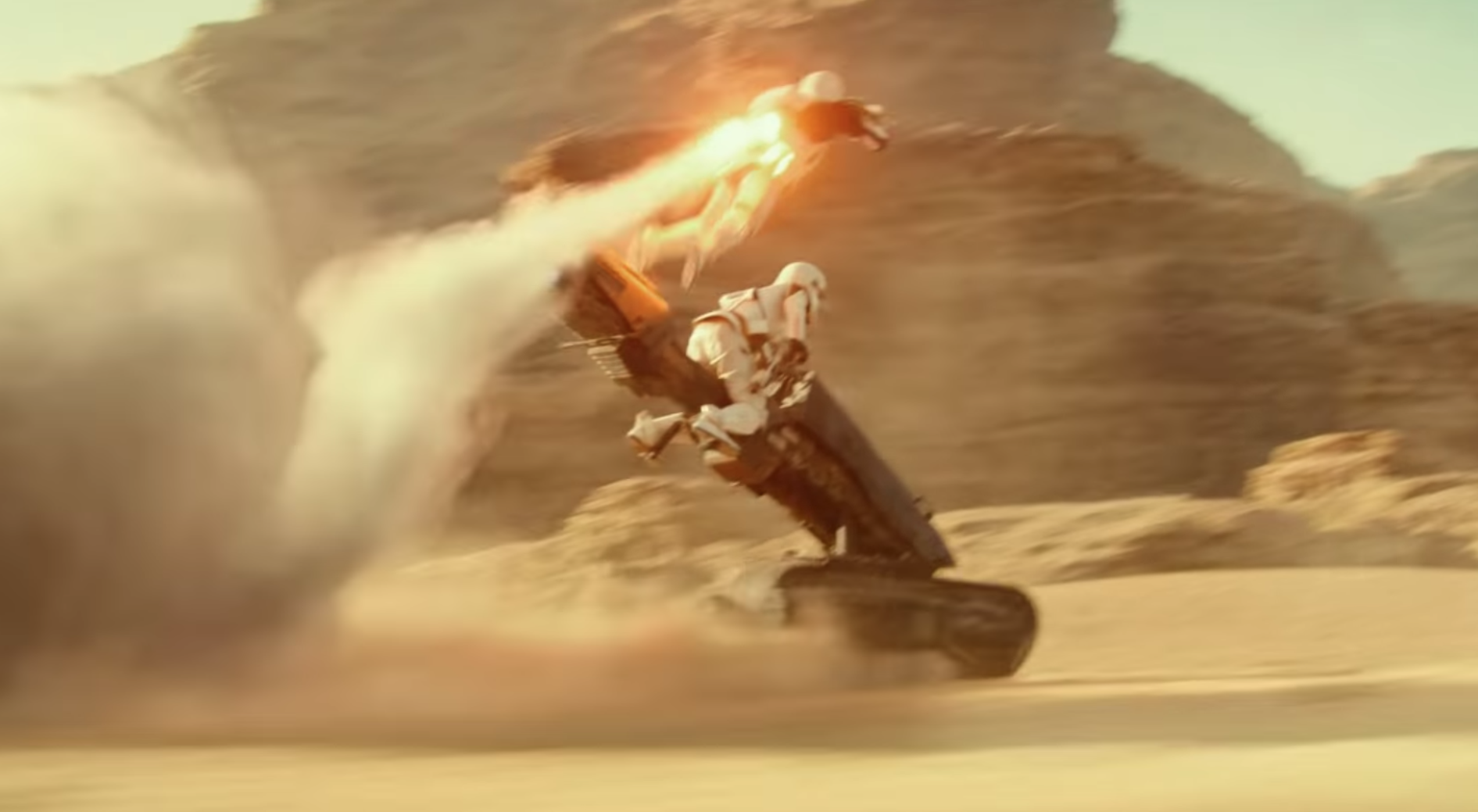 Este grito se puede escuchar justó en el momento en el que el Jet Trooper sale volando en el planeta de Pasaana y se estrella contra unas montañas, en la persecución que tienen los Jet Troopers abordo de sus speeders contra Rey, Finn, Poe, Chewbacca, C-3PO y BB-8.