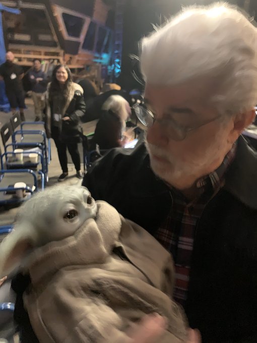 Jon Favreau publicó una foto en su cuenta de Twitter en donde podemos ver a George Lucas en el set de The Mandalorian cargando a Baby Yoda, o "The Child" como se le conoce de forma oficial.