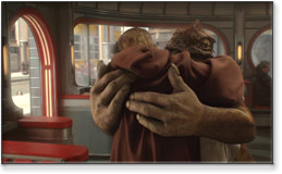 que en ésta escena vemos la cabeza de Ewan McGregor sobre un cuerpo digital con vestuario de Caballero Jedi. Rob Coleman trabajó junto con George Lucas en las escenas en las que las animaciones interactúan con los actores. En ese momento no solamente están contando una historia, sino que están tratando de convencer al subconsciente del espectador de que se trata de una imagen real, y no de algo fantasioso que no puede suceder. Además del abrazo existen otras señales que nos indican que Obi-wan y Dexter son viejos amigos, como son las sonrisas y su conversación sobre la visita de Obi-Wan a los laboratorios de análisis Jedi. |