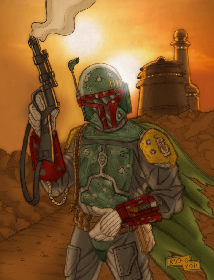 El día de hoy Richo comparte en exclusiva con nosotros la ilustración completa a color de Boba Fett, ya que en la revista apareció cortada.